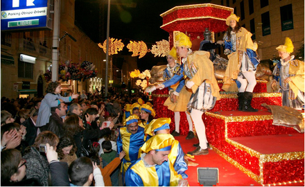 Paraderne med Melchor, Gaspar og Baltsar finder sted den 5. januar sidst på eftermiddagen. Karosserne kører gennem gaderne, der er pakket med børn og voksne, som venter tålmodigt - og utålmodigt - på det magiske syn af gavebringerne.