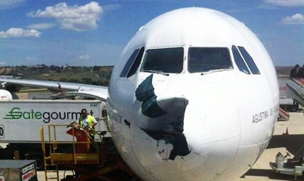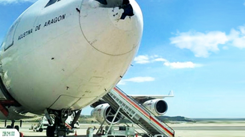 En Airbus A340 fra Iberia, som netop var lettet fra Barajas Lufthavnen i Madrid på vej mod Puerto Rico med 151 passagerer ombord, kolliderede i 2.000 meters højde med en kæmpegrib og blev tvunget til at nødlande.