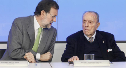 Formanden for PP, Mariano Rajoy, sludrer med Fraga i 2011