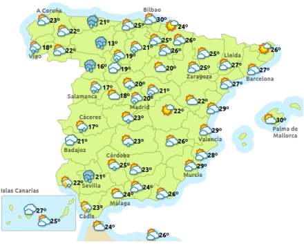 Valencia får fint vejr med en enkelt sky hist og pist og 21 til 30 grader, Málaga får overskyet vejr, men det skulle holde tørt og hen imod aften klarer det op. Temperaturerne ligger på mellem 21 og 27 grader.