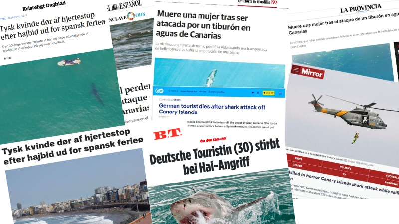“Tysk kvinde dør af hjertestop efter hajbid ud for spansk ferieø”, skriver Kristeligt Dagblad. Et utal af andre danske medier har en variation over samme rubrik.