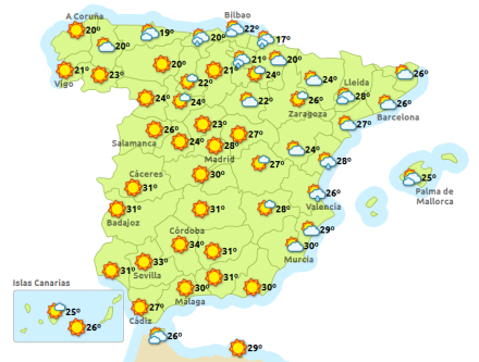 Vejret i Spanien, torsdag klokken 15:00