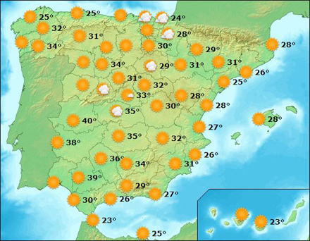 Madrid får i dag mellem 22 – 36 grader, Barcelona 20 – 31, Valencia 21 – 31 grader og Málaga 21 – 29 grader.