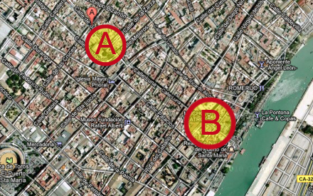 A: her styrtede helikopteren ned. B: Pladsen ved de kendte skaldyrs-restauranter. Der er ca. 400 meter mellem A og B. I området ved nedstyrtningen ligger mange hoteller.
