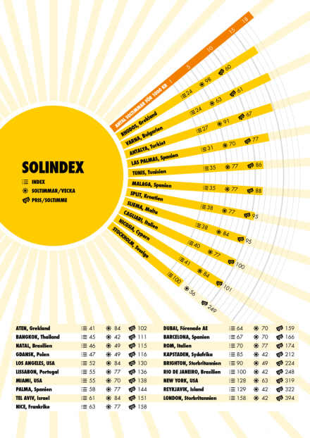 Solen betyder antal solskinstimer om ugen i juli måned. Index er betegnelsen for, hvor dyrt stedet er. Et højt tal betyder, at stedet er dyrt. Det gælder altså om, både at have lave priser og mange solskinstimer for at havne i toppen af listen. Bemærk at prisen per solskinstime er angivet i svenske kroner.