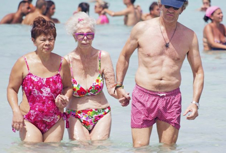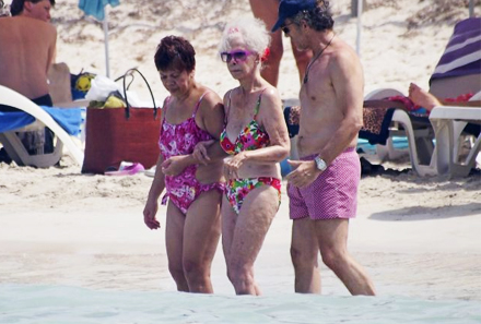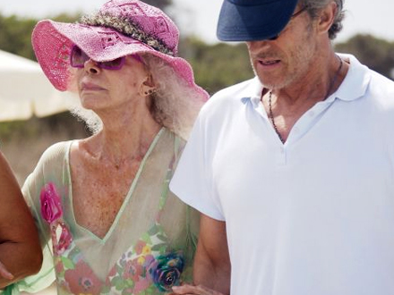Med sin blomstrede bikini og mærkesolbriller faldt hun ind i strandbilledet som en glad bedstemor på sommerferie med familien, og ikke en af verdens mest velhavende kvinder, som ifølge Guinness Rekordbog har det største antal adelige titler i hele verden.