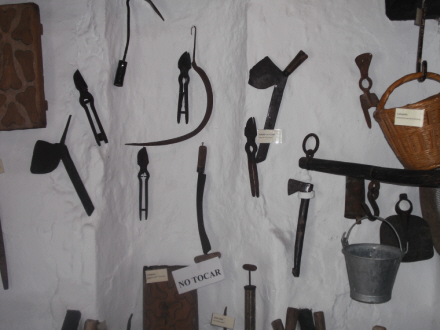Stueetagen har udstilling med værktøj og grej, der er uundværlig under fremstillingen og bearbejdningen af rosinerne. Bastkurve til transport og sakse til beskæring af druerne.