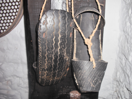 I den kuriøse afdeling findes arbejdssandaler, fremstillet af gamle bildæk. De er både skridsikre og billige at lave.