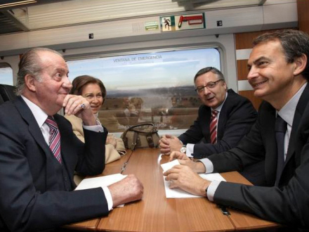 Ved ankomsten til Valencia: Til venstre José Luis Zapatero på talerstolen og til højre giver den folkekære Kong Juan Carlos Udviklingsminister, José Blanco, en odentlig krammer
