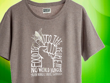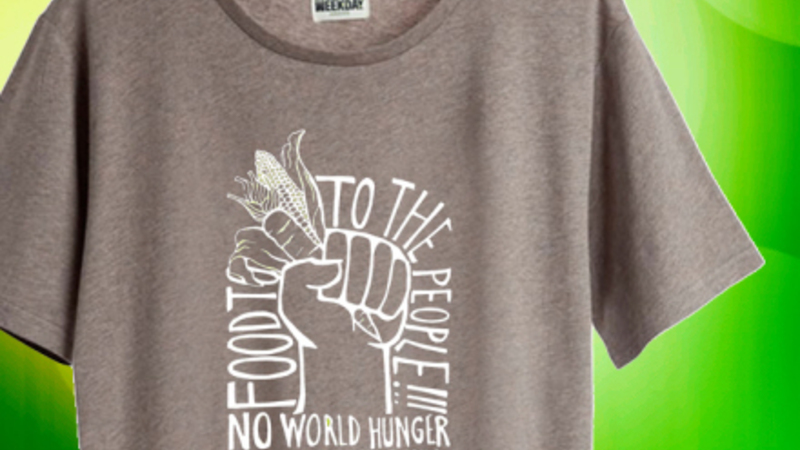 På t-shirten er der også et af de mest populære citater fra Gordillo: ”Mad til Folket! En verden uden sult”, står der på den polemiske T-shirt, som var H&M blevet venstrefløjens nye bannerfører. At der er et ekstra 'T' i ordet 'FOOD', er der til gengæld ikke megen opmærksomhed omkring.