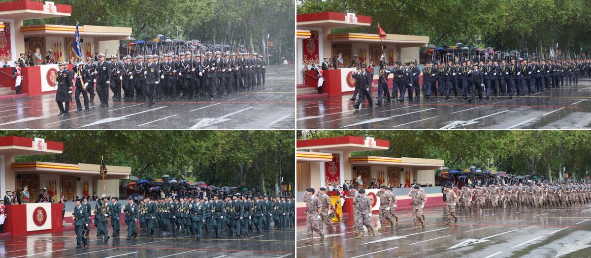 Efter hyldesten til dem, der gav deres liv for Spanien, overværede kongen, dronningen og kronprinsessen paraden af hæren, flåden, civilgarden, den militære beredskabsenhed, den kongelige garde, statens sikkerhedsstyrker og -korps og forskellige sikkerheds-, civilforsvars- og beredskabsorganer.