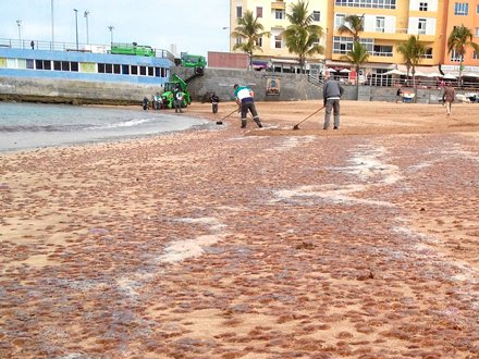 Også på De Kanariske Øer er der konstateret usædvanligt mange brandmænd. Alene på Gran Kanarie måtte 60 personer en tur på skadestuen, efter at brandmænd indtog Canteras-stranden i Las Palmas. Her har kommunen nu besluttet at opsætte net for at holde brandmændene væk fra de mest populære badestrande.