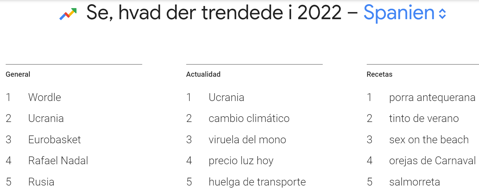 I Danmark er der blevet fokuseret på lidt andre sager... Her fremhæver Google søgninger på 'dansk politik', 'danskere' og 'mest trendede søgninger'. Den sidstnævnte svarer til 'general' i den spanske, så lad os starte med den.