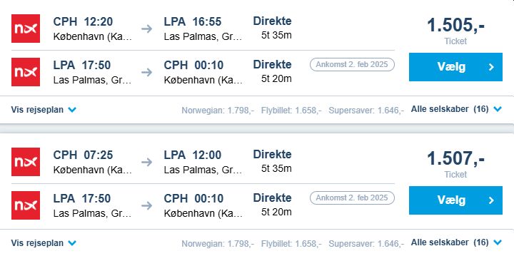 Vi har valgt lørdag den 25. januar som afrejsedag fra København og kun medtaget direkte flyvninger, hvis muligt, og de billigste priser. Vi har benyttet travelmarkets søgemaskine.