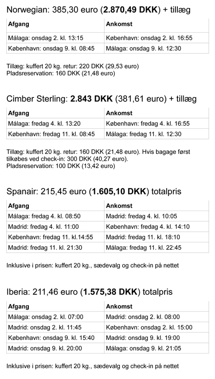- Vi har søgt på udrejse fra Málaga den torsdag den 3. november og retur fra København ugen efter torsdag den 10. november.