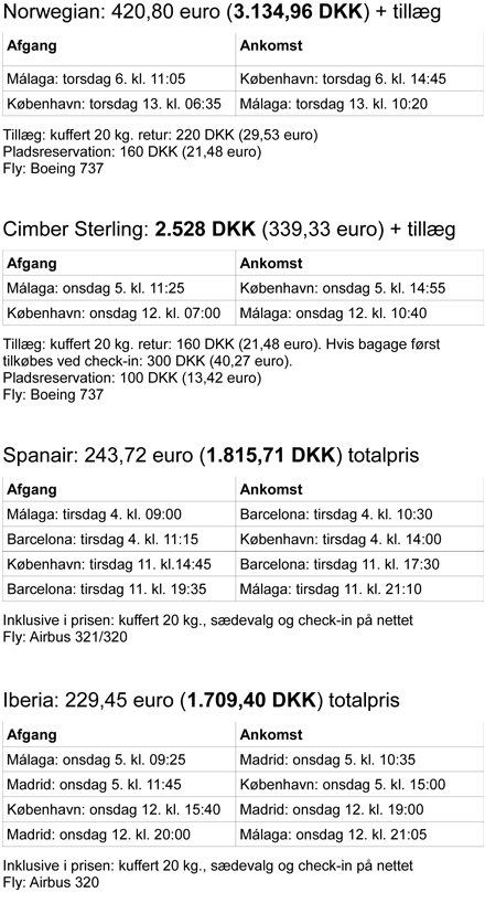 Billigst er Iberia, derefter Spanair, Cimber Sterling og Norwegian. Faktisk koster Iberia kun halvdelen af Norwegian og med en besparelse på 242 euro (inklusive bagage og sædeplads) kan mange sikkert godt holde en mellemlanding ud på en times tid.