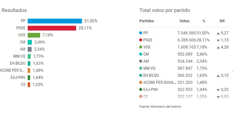 Stemmerne til Unidas Podemos er fordelt på 0,60 procent til Podemos plus IU, 1,15 procent til Con Andalucía-koalitionen og 0,26 procent til Elkarrekin Podemos, blandt andre alliancer.