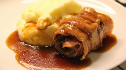 Oksekødet afpudses, skæres i passende stykker. Strimler af det røgede spæk samt lidt persille lægges på, rul kødet im fyldet og luk med tandstikker eller bind med snor. Drys med lidt salt og peber, vær ikke for rundhåndet med saltet, da spækket afgiver salt.