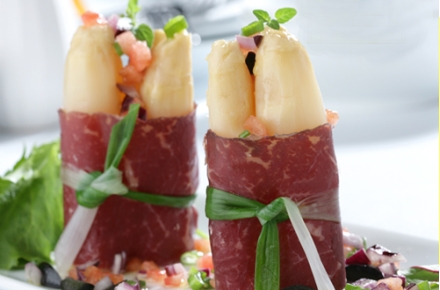 Dagens menu er serrano-skinke rullet om palmemarv, oksekæber med den skønneste sovs og til dessert chokoladeis med nøddekrokant.