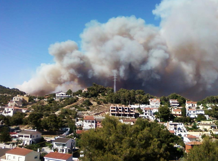 Mindst 570 hektar pinje-skov i Alt Penedès og el Garraf er brændt ned, og 300 beboere i en nærliggende urbanizacion i Canyelles har været tvunget til at tilbringe natten udendørs. I morges kl. syv blev der indsat ekstra redningsmandskab, helikoptere og brandslukningsfly i kampen mod flammerne, der fortsat æder løs af det tørre landskab.
