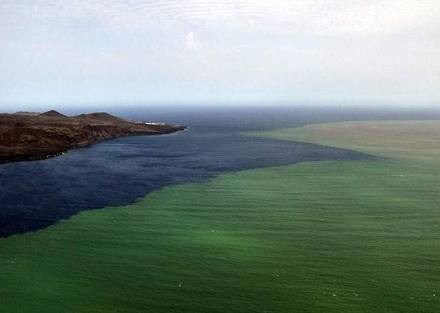 Havet er farvet helt grønt af udslippet på bunden