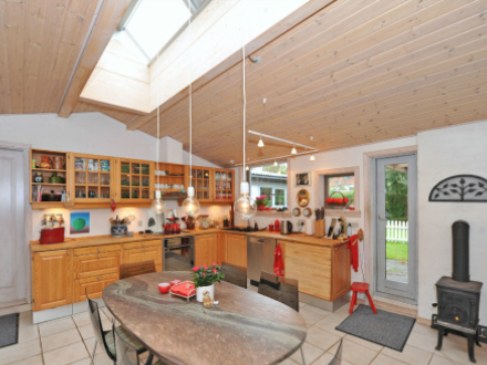 H-husets planløsning er skarp og enkel. I husets midte entre, badeværelse og køkken-alrummet med loft til kip, stort ovenlys, brændeovn og masser af plads.