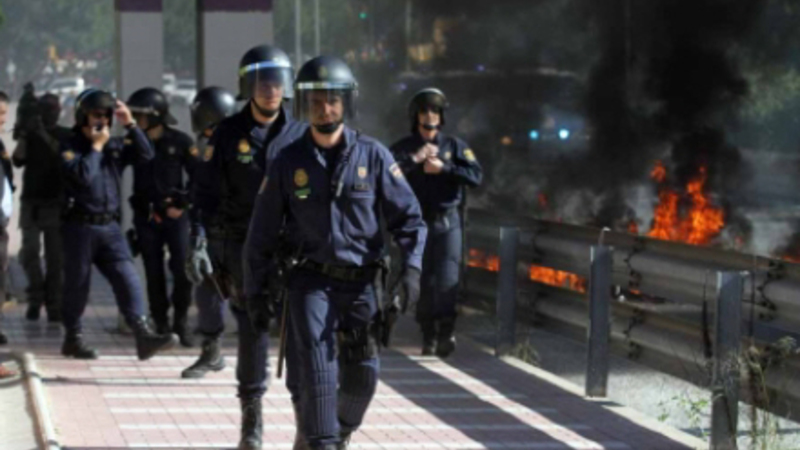 Aktivisterne spærrede Avenida Valle-Inclán for trafik ved at sætte ild til en række bildæk, som lå tværs hen over vejen.