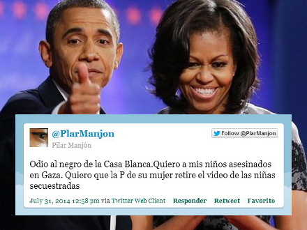 I det chokerende tweet udtrykker Pilar Manjón sit had til den sorte præsident og lader sin vrede og frustration over de meningsløse bombninger af Gazas palæstinensiske indbyggere gå ud over Barack og Michelle Obama.