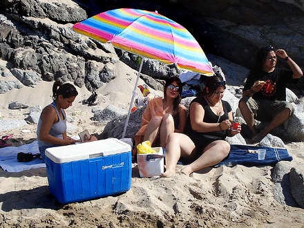 Det bugner med køletasker med masser af mad, frugt og drikkevarer under parasollerne denne sommer. Ved bordene sidder familierne samlet og spiser med fødderne i sandet i stedet for at sætte sig op i restauranten med hvide duge og tjenere.