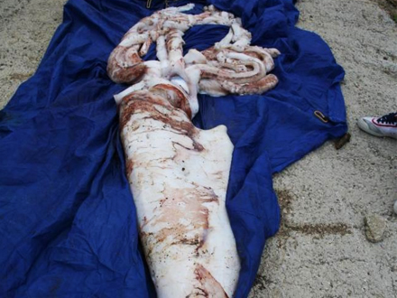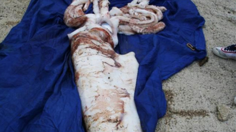 Det er ikke hver dag man finder en kæmpe-blæksprutte på stranden, og da slet ikke én, der er fire meter lang!