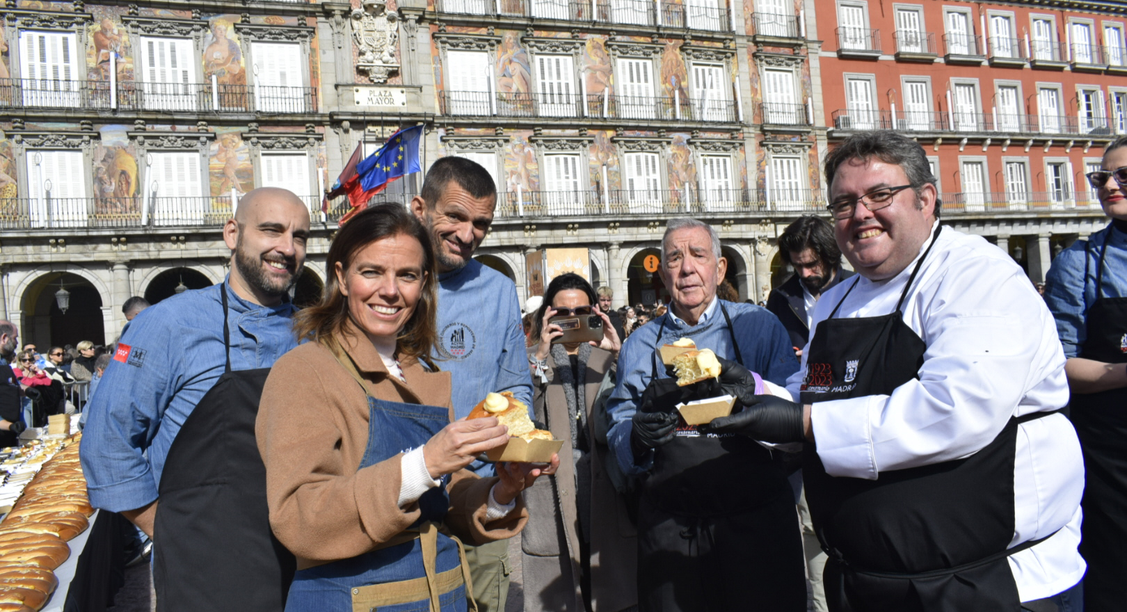 Plaza Mayor var rammen for Asociación de Cocineros y Reposteros de Madrid, ACYRE Madrid, der vanen tro tilberedte en gigantisk Corona de La Almudena, som blev serveret i tusindvis af portioner til offentligheden.