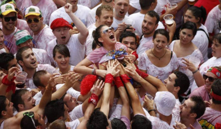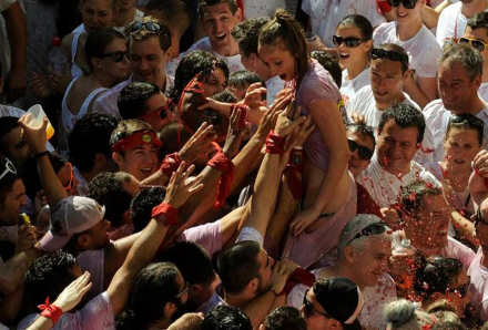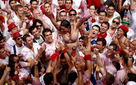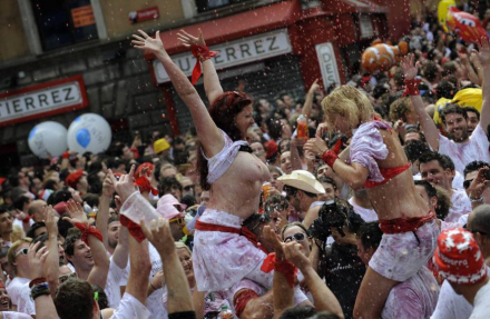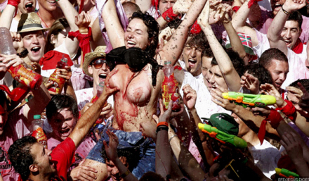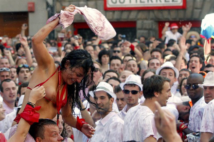 Chokerende billeder af tidligere chupinazos viser topløse, unge kvinder blive løftet op i folkemængden, mens mændene omkring dem benytte lejligheden til at befamle dem godt og grundigt. Det hele bliver godt vædet i sangria og vin.