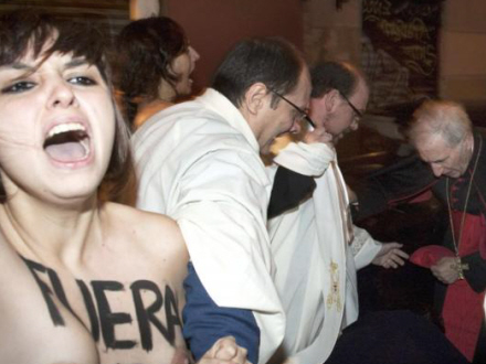 Fem topløse demonstranter slog ud mod ærkebiskop Antonio Maria Rouco Varela, da han steg ud af en bil for at deltage i søndagsmessen. Kvinderne havde overkroppen overmalet med slagord og kastede røde trusser mod ærkebiskoppen, der siges af være en af drivkræfterne bag den konservative regerings planlagte abortreform.