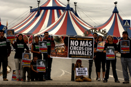 I en måned har AnimaNaturalis protesteret mod mishandling af de vilde dyr i forestillingerne uden for cirkusteltet .