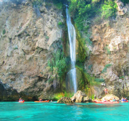 Turen slutter ved et spektakulært vandfald nær Maros strand, som vores lille flok amatør-kajakister ikke var de eneste der kendte til. Der var et par speedbåde, et par vandscootere 2-3 andre hold kajakker og en masse andre mennesker.