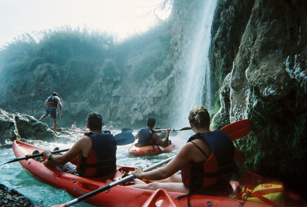 Hvis man får det timet rigtigt, kan man lige snige sin kajak igennem vandfaldet, for at få en ekstra kold dukkert. Det kan være nødvendigt i varmen.