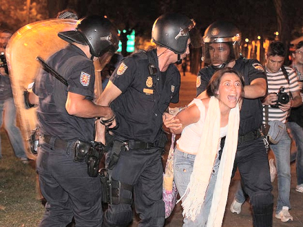 Den strategi gik i vasken. Næsten 1000 demonstranter fra M-15 bevægelsen havde i timerne forinden belejret pladsen foran ministeriet, efter at de havde gået i protest gennem Madrids hovedgade Gran Vía og forgæves forsøgte at nå frem til målet, Puerta del Sol.