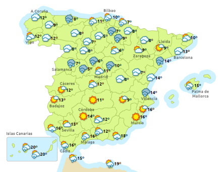 Vejret i Spanien, onsdag klokken 14:00