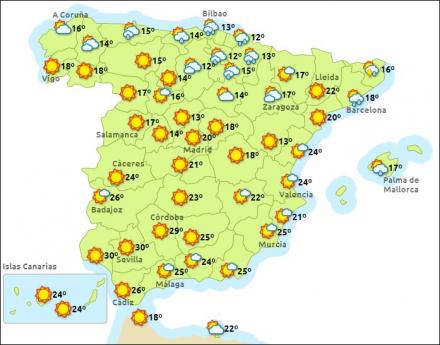 Madrid, solrigt, ti – 22 grader, Barcelona, skyet, 14 – 20 , Valencia, solrigt, 13 – 23, Málaga, skyfrit, 18 – 29 grader.