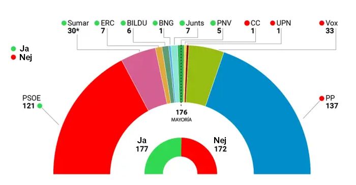 Kongressen godkendte amnestiloven torsdag formiddag med et absolut flertal på 177 stemmer for og 172 stemmer imod fra PP, Vox, UPN og Coalición Canaria.