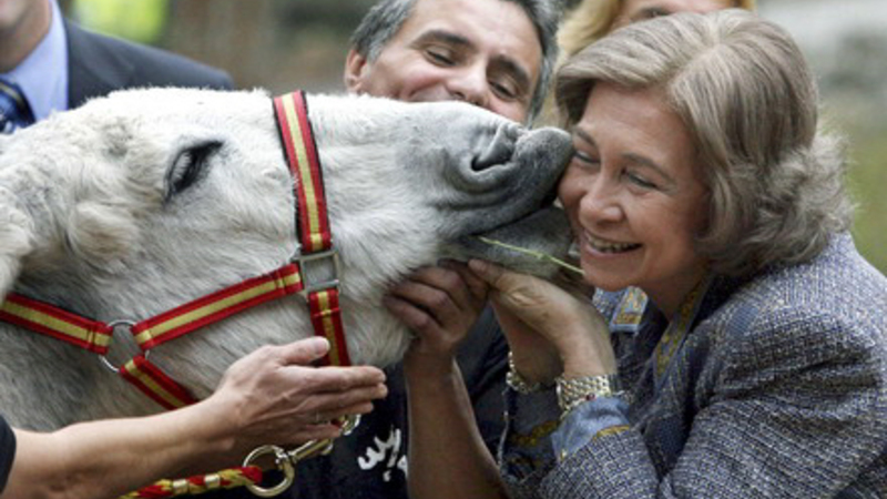 Dronning Sofia var ikke nærig med kærligheden, da hun besøgte stedet i 2008. Hun døbte dette æsel-føl Lluvia - Regn