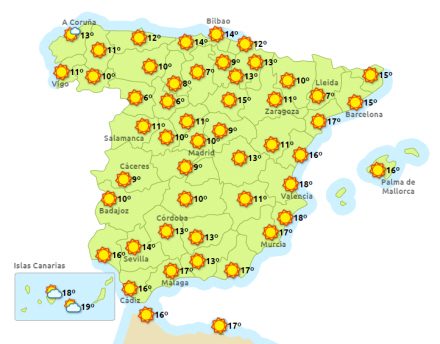 Dagtemperaturerne stiger i de østlige egne af fastlandet og på Balearerne. Ikke nogen nævneværdige ændringer i resten. Om natten er temperaturerne uændrede undtagen på Balearerne og i Levanten, hvor den falder en smule.