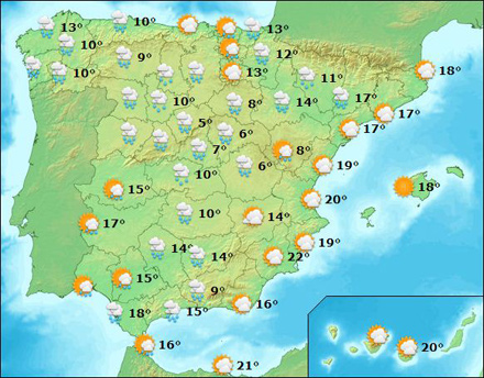 Vi får i dag mest skyet vejr, og der kommer nogen eller en del nedbør. I Galicien kommer der kraftig nedbør, mens de sydlige egne slipper med let nedbør hist og pist.