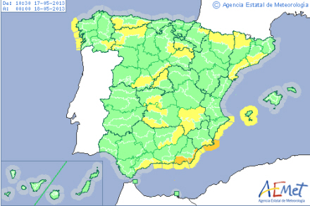 Det bliver også blæsende og der er varsel om høje bølger langs kysterne i det østlige Andalusien, i Nordvestspanien og på Balearerne. Ved stormende kuling kan bølgerne komme op i 2,75 meter, som bryder med massive skumsprøjt, så du skal nok ikke alt for tæt på havet.
