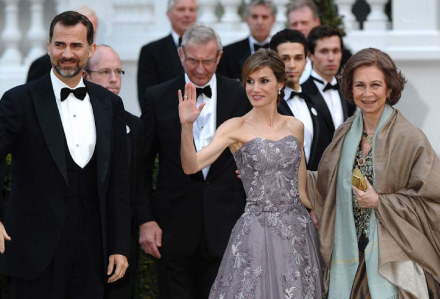 Dronning Sofia, hvis kjole er kreeret af Margarita Nuez, Kronprins Felipe og Kronprinsesse Letizia. Hendes noget afdæmpede kjole er kreeret af Felipe Valera