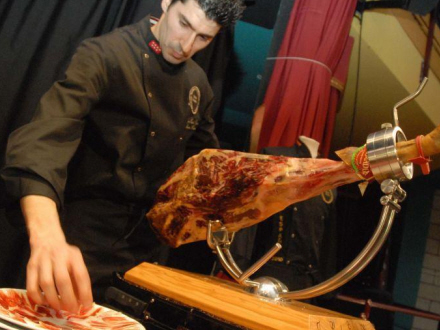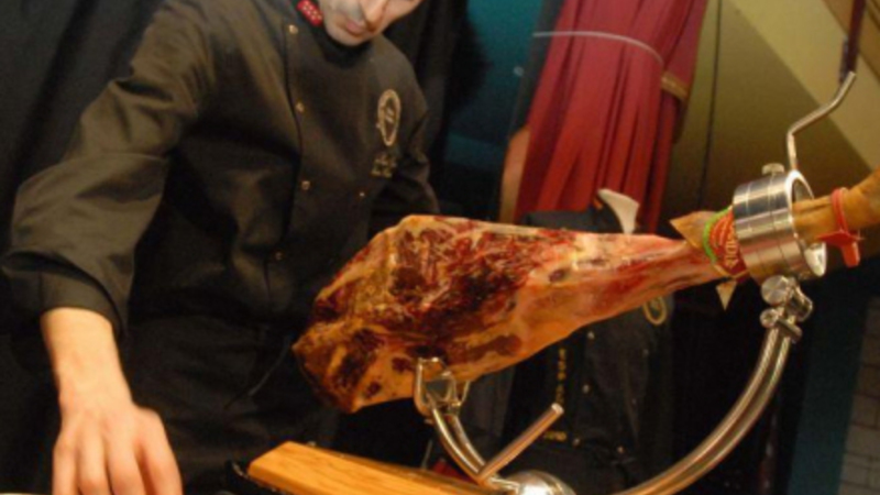 Under et skinke-skærer-arrangement i Málaga sponsoreret af Navidul, der er et af landets største skinkefirmaer, afslørede Gomez hemmelighederne bag, hvordan man skærer et stykke skinke af benet, uden at der ryger en luns hud med under det skarpe sværd.
