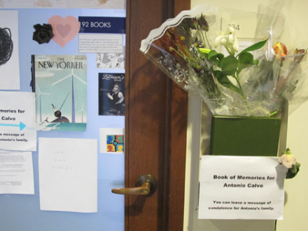 Der er opsat en lille kasse på universitetet, hvor man kan efterlade kondolencer og blomster til Calvos pårørende