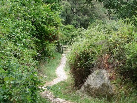 Her skal vi lige ud ad en sti, der går opad og som er brostenbelagt. Vi stiger op en god halv time, indtil vi kommer til en grusvej. Her skal vi til højre, og lige derefter skal vi ind gennem en låge på venstre hånd. Vi kan ane stien, som går opad en kort stund indtil et skilt, hvor der står Sendero til venstre og Ubrique lige ud.