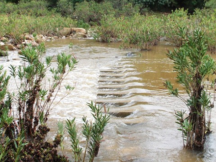 Vi går langs med stien helt hen til det sted, hvor 'stepsten' fører over floden – her er de alle intakte, så det er ingen sag at krydse. Vi fortsætter langs med floden helt hen til det sted, hvor vi ikke kunne komme over i går og undrer os over, hvilken kraft floden har opbragt for at fjerne de tontunge sten, som vi ser ligge spredt langs med flodbredden som legoklodser.