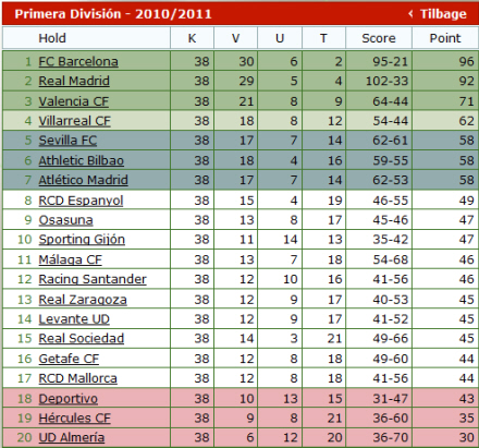 Den store taber i sidste spillerunde var Deportivo de la Coruña. Holdet tabte 0-2 til Valencia på hjemmebanen Riazor. Resultatet sender det tidligere galiciske storhold ned i den næstbedste række; Liga Adelante.